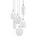 Simplistic elegant round six multi LED pendant with three styles of clear outer glass and frosted inner glass each set together as one piece (slender drop, pear shaped and round drop glass shades). New patent pending socket design and Kuzco SSL wire allow this fixture to be 12V AC LED. Metal details in chrome finish. Available in three different glass styled single pendants and a variety of multi-pendant options, see series for full details.
