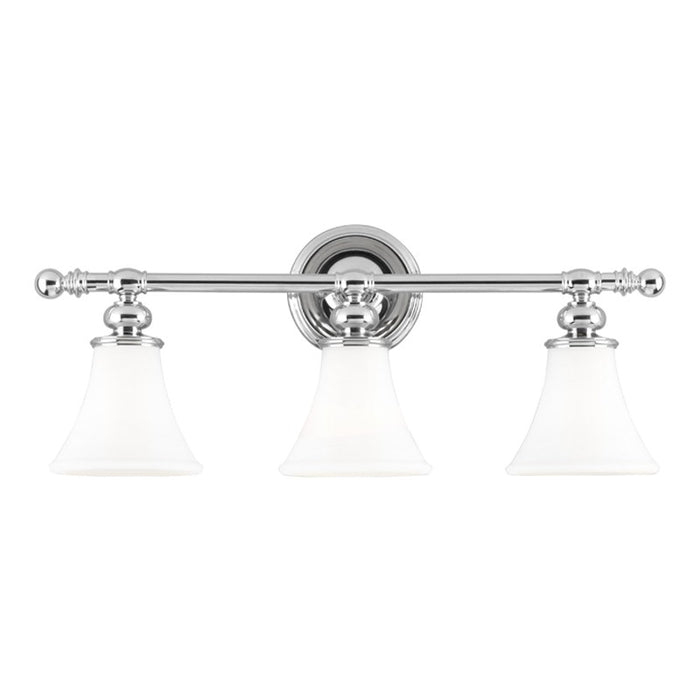 Bells of mouth-blown opal glass resound with timeless style in our Weston bath family. Cast oblong-shaped socket bases suggest a variety of styles into which the fixture could fit. Capping the ends of the bath bar with ball finials complements the circular shape of the backplate.