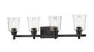 Frame a master or guest bath sink with elegance, and add this brushed nickel four-light vanity light to a new or remodeled bath space. Contemporary and transitional, its versatile motif hits on a beautiful blend of durable steel and soft, delicate bell shades fashioned from clear seedy glass.