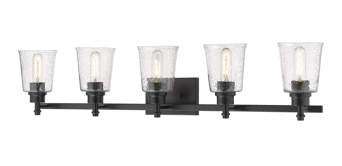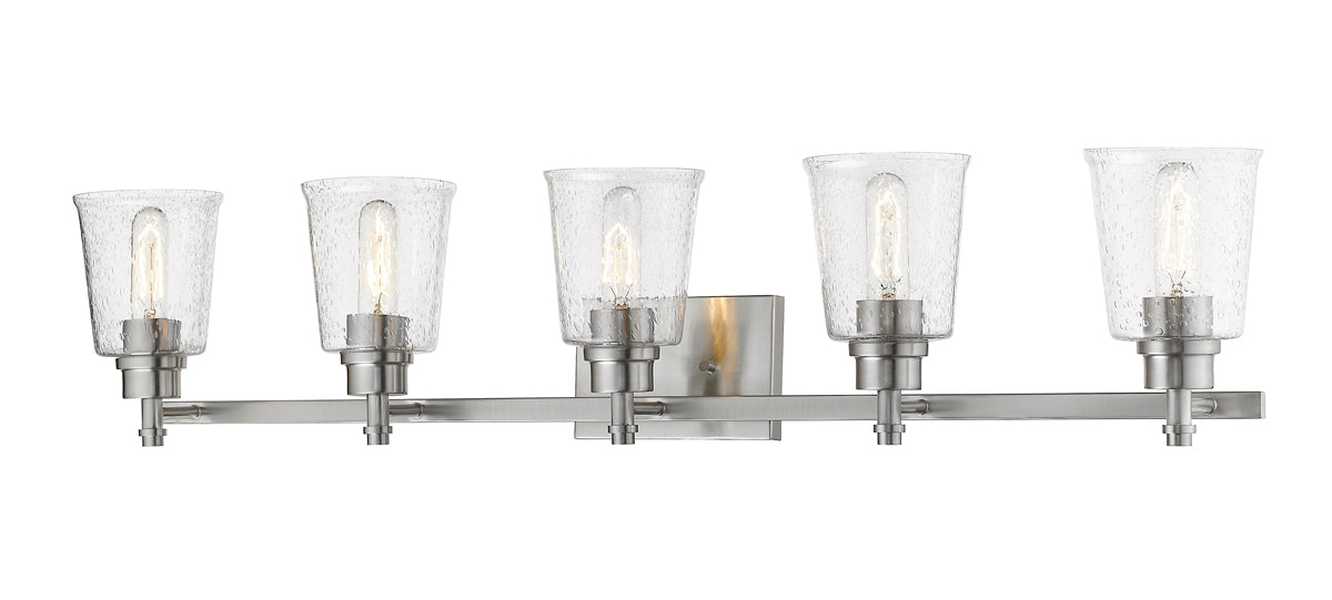 A master en suite gains exceptional elegance with this brushed nickel five-light vanity light. Enjoy the artistic and architectural design of a stunning fixture with clear seedy glass shades, offering a perfect fit to both contemporary and transitional decor schemes.