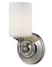 A matte opal glass shade rests elegantly upon beautifully designed hardware, which is finished in brushed nickel, creating a look that is uniquely modern. This wall sconce will add a touch of modern class where ever it is hung.