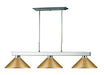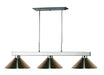 Straight line inspired detailing defines this beautiful three light fixture. Finished in brushed nickel and paired with metal brushed nickel shades, this three light fixture would be equally at home in the game room, or anywhere else in the house needing a touch of modern charm. Adjustable rods are included to ensure the perfect hanging height.